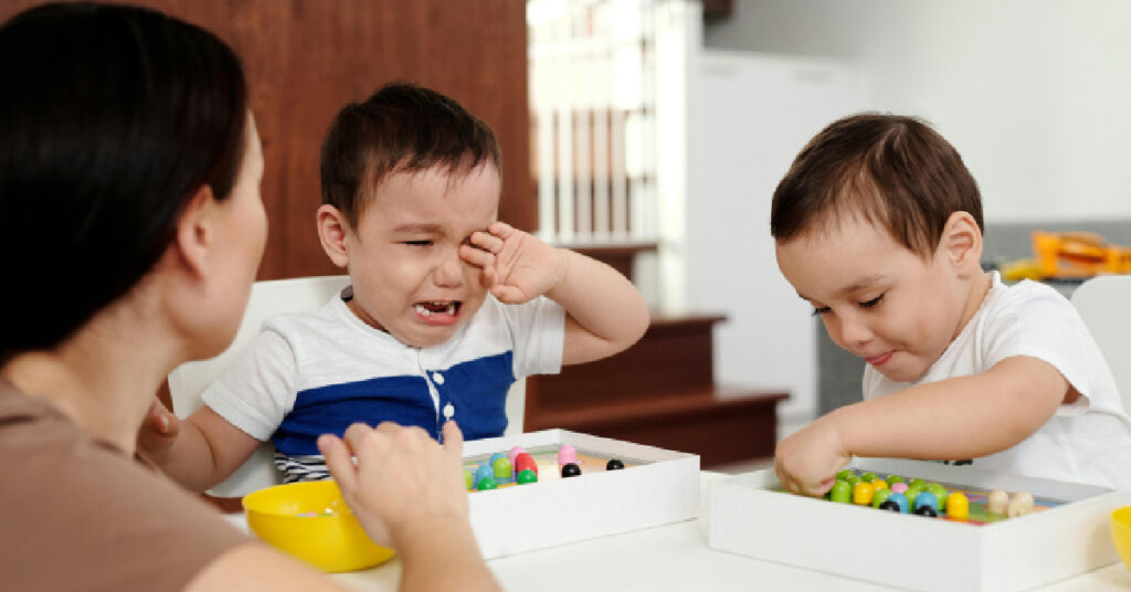 Sibling Independent Play - Feature Image Two kids playing at table with mum one having a meltdown